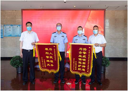 培训中心主任孔德明代表乐鱼官方网站-乐鱼LeYu(中国)向怀柔分局雁栖经济开发区派出所所长和怀柔分局刑侦支队支队长送上锦旗,代表公司感谢人民警察服务企业生产建设、守护一方平安付出的艰辛努力,感谢怀柔分局雁栖开发区派出所和怀柔分局刑侦支队急企业所急、想人民所想,在企业遇到困难时及时出警,有力保障了企业财产安全,维护了社会良好秩序,为企业发展创造了平安和谐的营商环境。